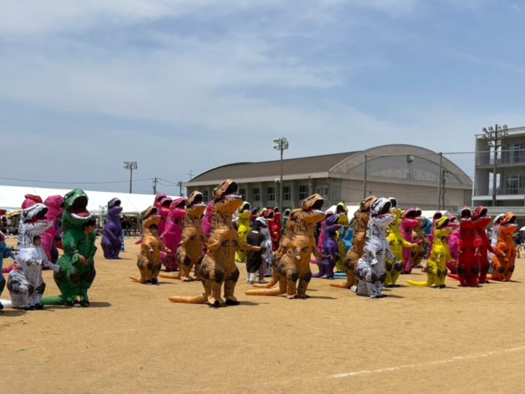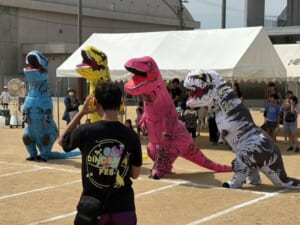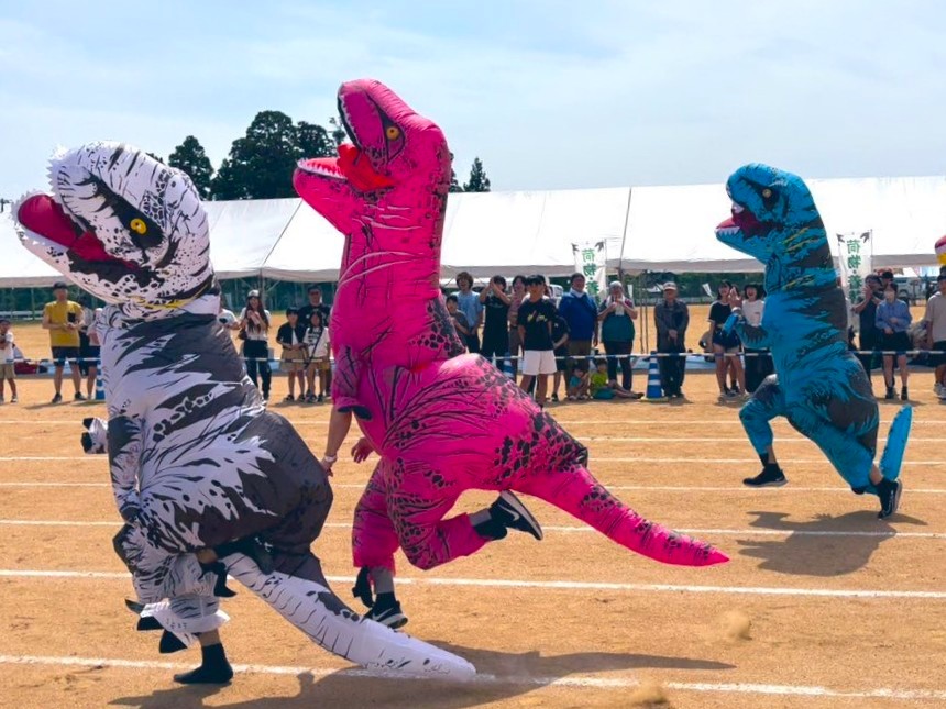 メインイベントは、恐竜の着ぐるみで50mを駆け抜ける「ティラノサウルスレース」。