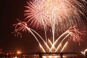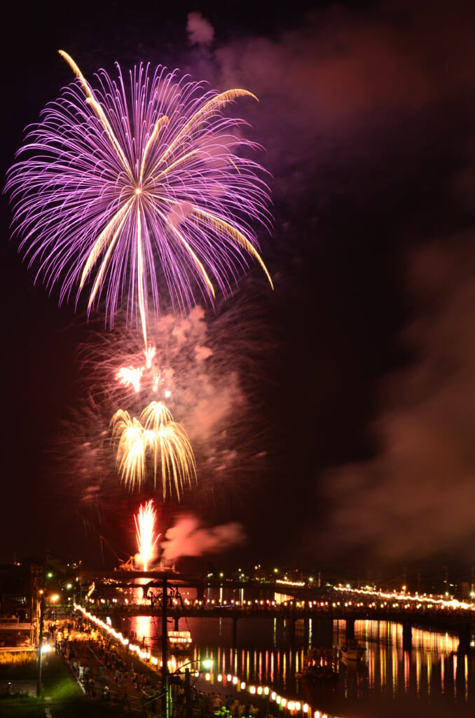 幻想の火流しと花火が、夏の夜をやさしく照らす。