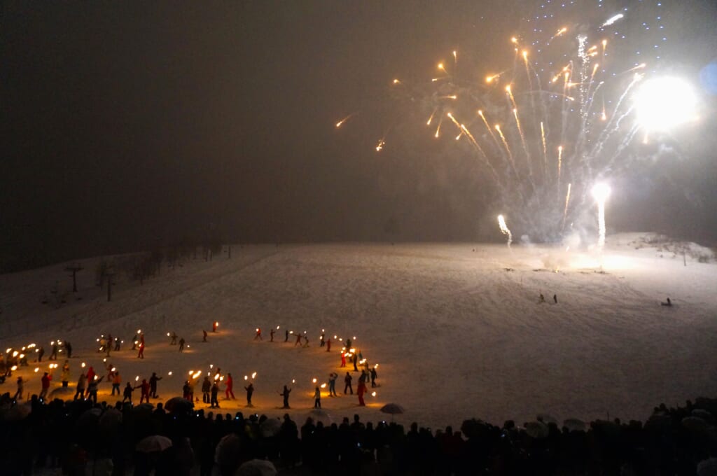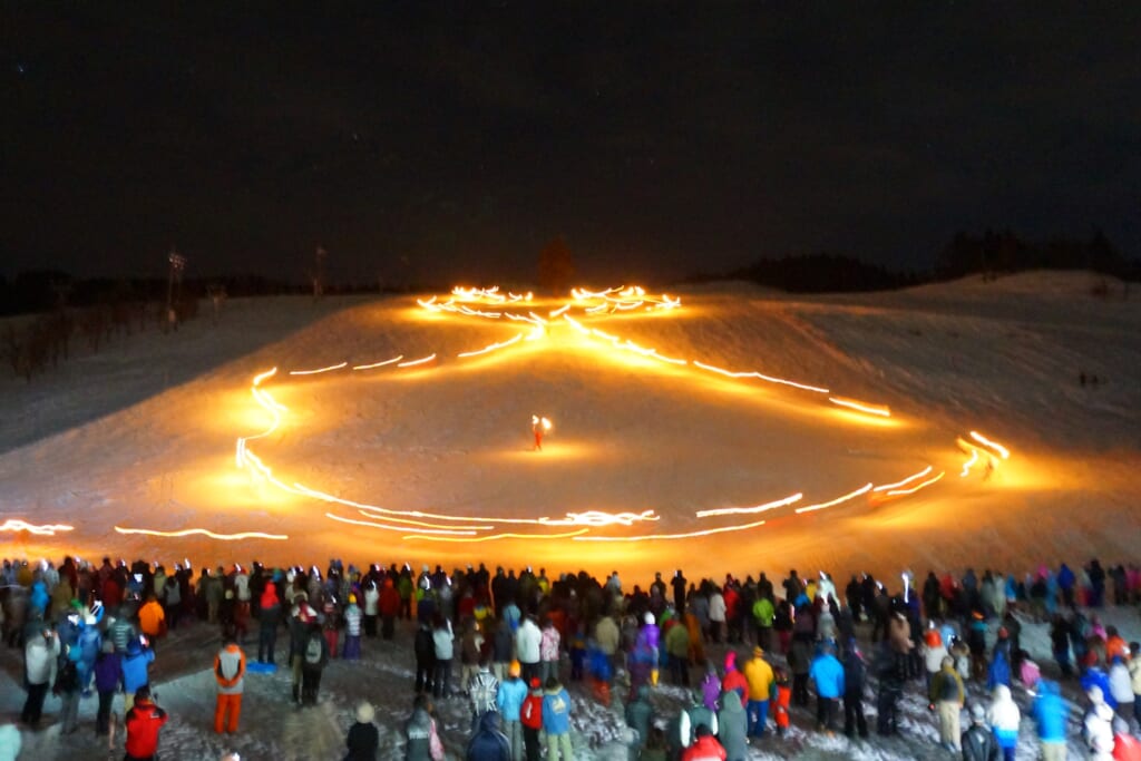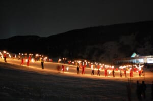 ゲレンデが一斉に静まり、たいまつを手にしたスキーヤーたちが滑り出すと、