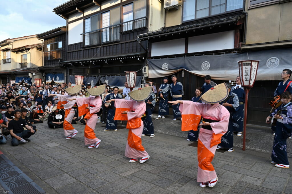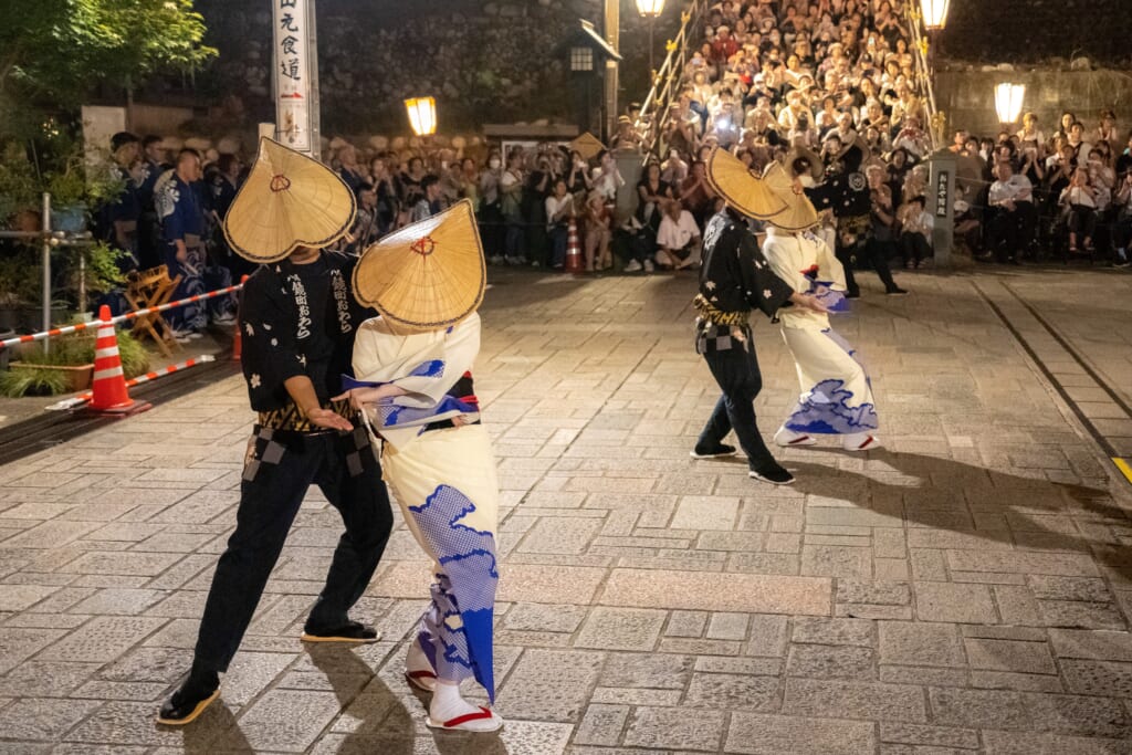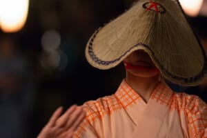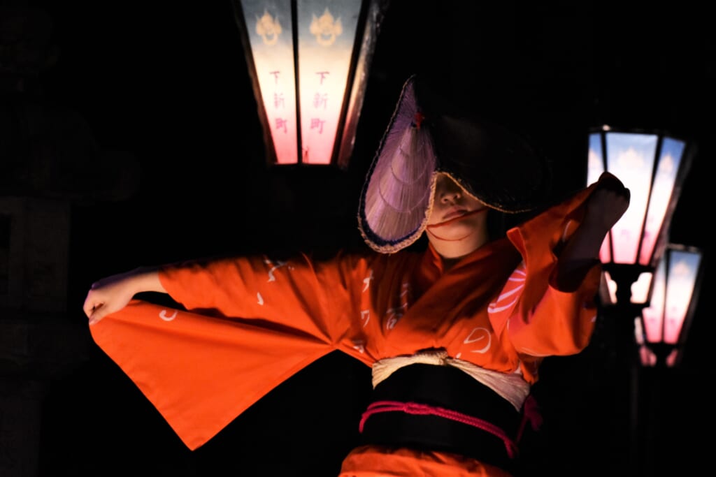 その町並みに寄り添うように、ぼんぼりがひとつ、またひとつ灯ると、編笠を深くかぶった踊り手たちが、三味線と胡弓の哀切な音色に合わせ、ゆっくりと、しなやかに、流し歩きます。