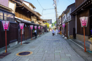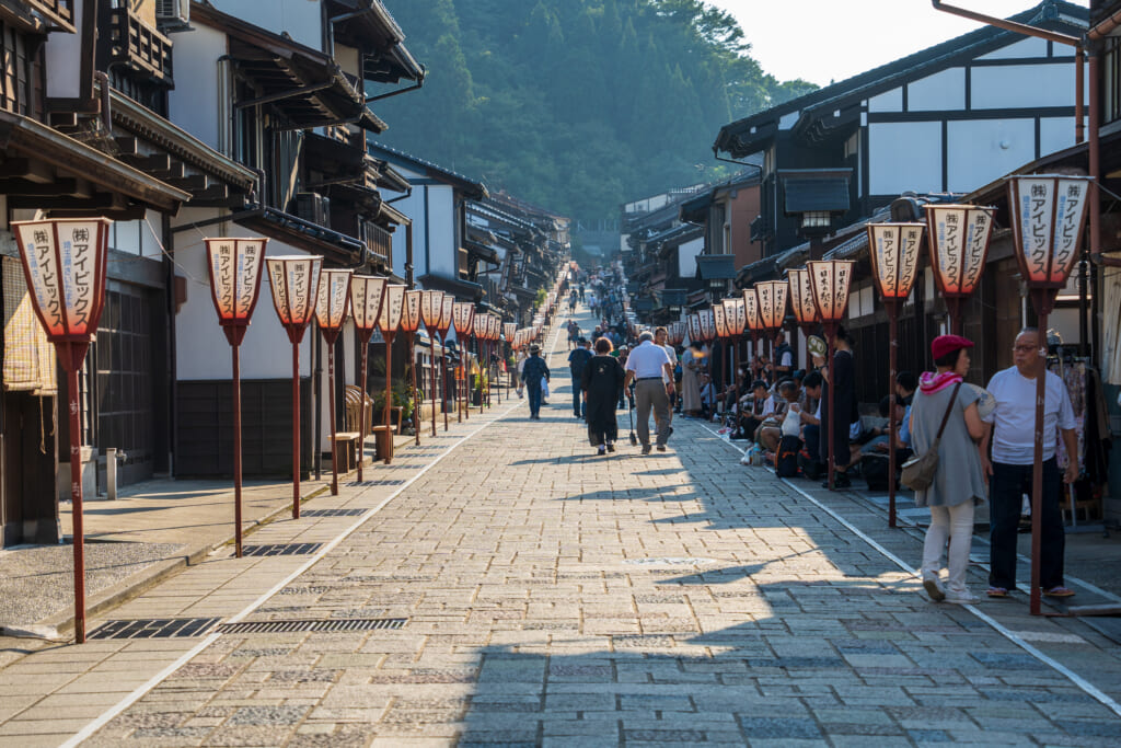 格子戸の家並み、白壁の土蔵、曲がりくねる石畳。