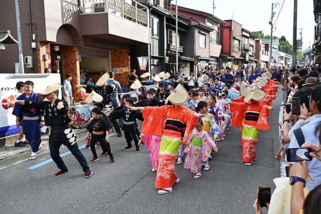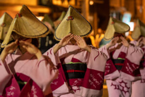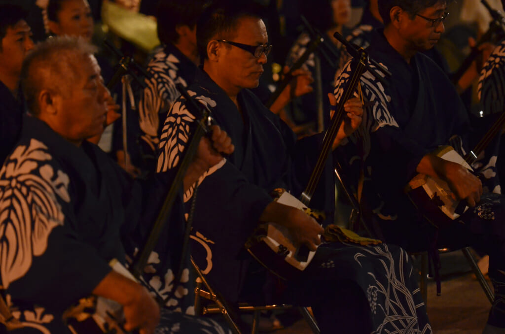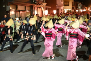 11の町それぞれに踊りや浴衣の色があり、町(支部)ごとに、風景も音も表情も異なるのが魅力。観る者は気づけば踊り手の後ろに並び、夜の町と音色に身をゆだねてしまいます。