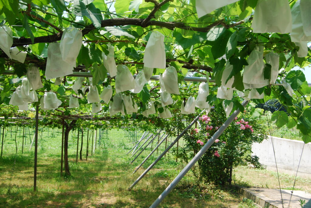 4代目が受け継ぐぶどう栽培は日本にしかない「棚栽培」を行っていて、ぶどうがたわわに実る棚の下でご自身で選んで摘み取っていただけます。