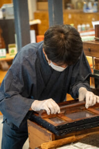 店頭では、昔ながらの木製の「製丸機」を使い、職人の手仕事による丸薬づくりの実演を見学でき、実際に製丸作業を体験することも可能。