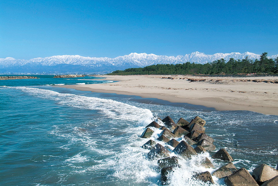 白い砂浜に沿って伸びる松林と、南東にそびえる立山連峰。