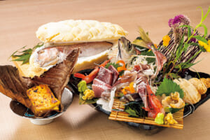 朝どれ鮮魚を盛り合わせたお刺身をはじめ、氷見牛ステーキ、白えびかき揚げ、ホタルイカ沖漬け、バイ貝煮付けなど、富山ならではのグルメを地酒とともに楽しめます。