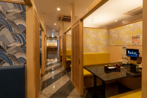 2~8人掛けのテーブル席は全て個室で、基本はタッチパネルでオーダー後、レーンから送る「出来たて」を小窓から受け取るスタイル。