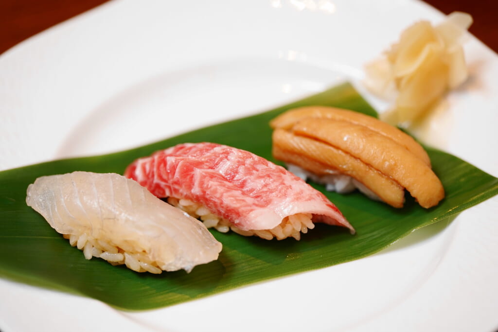 富山県内の各漁港から仕入れている天然物のネタ、上質なお米と水、そして本わさびを使用。