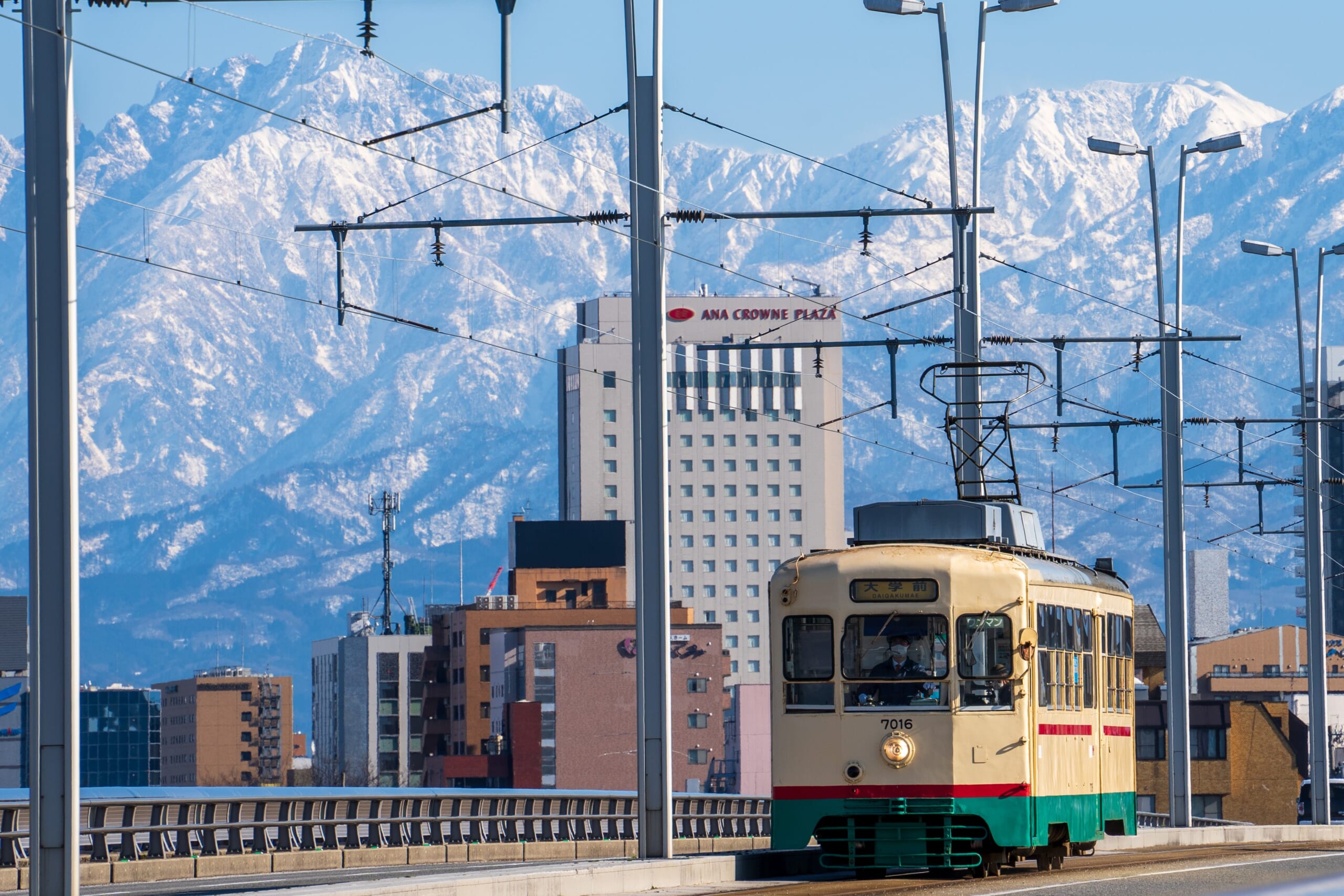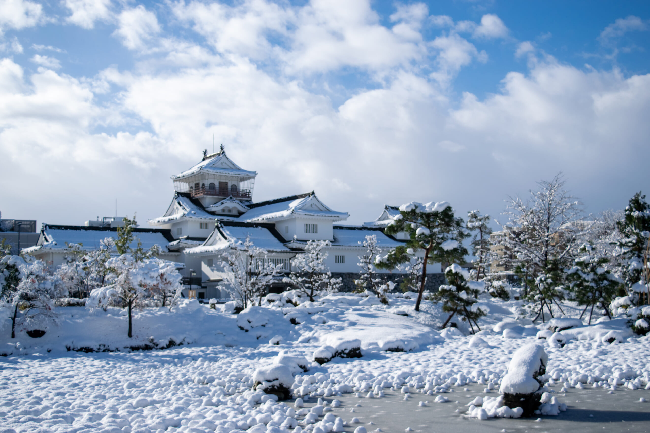 雪が降ると、市内のあちこちが白銀の世界に。富山城周辺や路面電車、神通峡など、いつもの景色が“冬の絶景”に変わります。