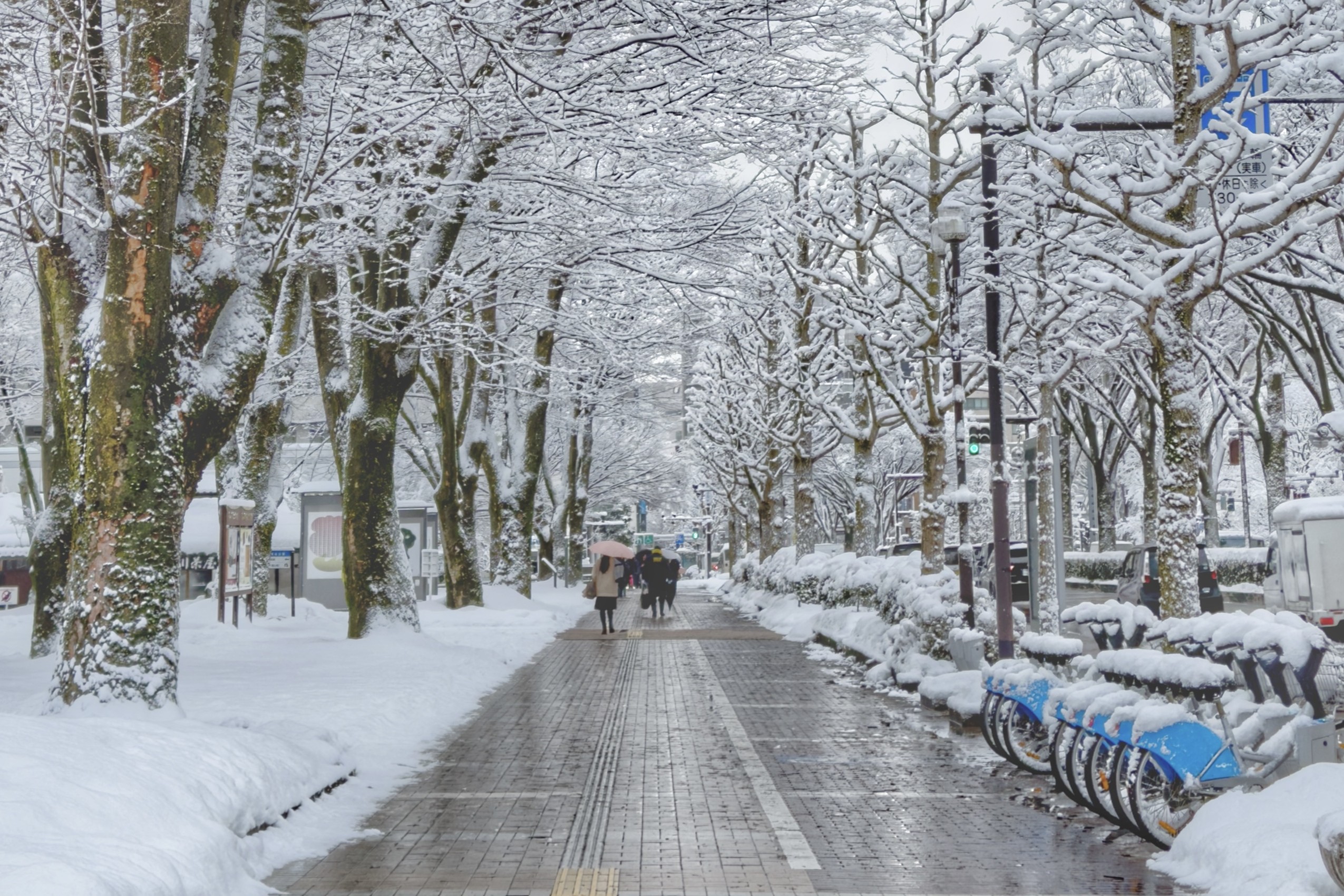 ※富山市中心部の歩道は、融雪装置やロードヒートが整備されているため、冬でも比較的歩きやすい環境です。ただし、日陰や朝晩は凍結しやすいので、滑りにくい靴を選ぶと安心です。