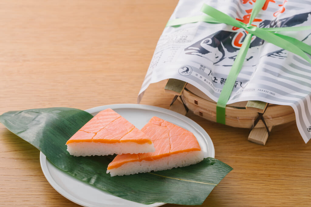 半レア食感の肉厚な鱒と、艶やかな県産米、笹の香りが重なる鱒寿しは格別。