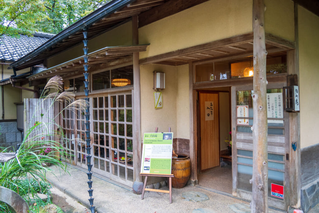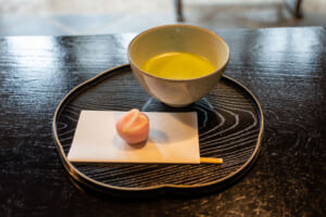 茶室「円山庵」では、立礼席で気軽にいただける抹茶と和菓子(700円)が人気。
