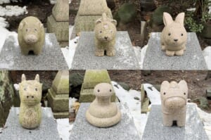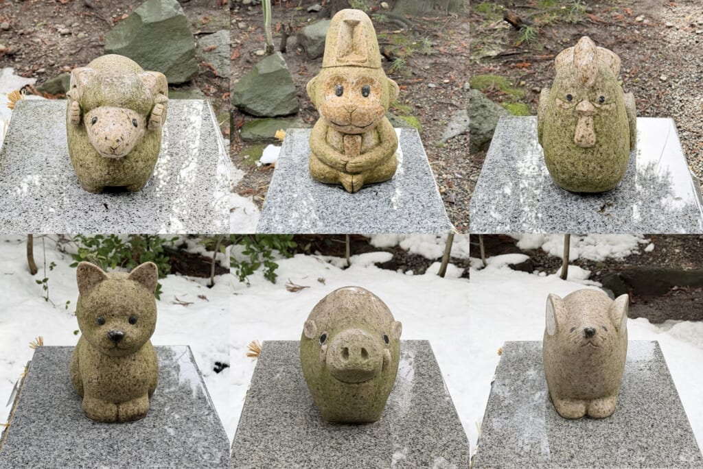 境内には干支の石像が並び、自分の干支を探したり写真を撮ったりと、参拝の楽しみが広がります。