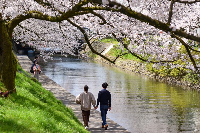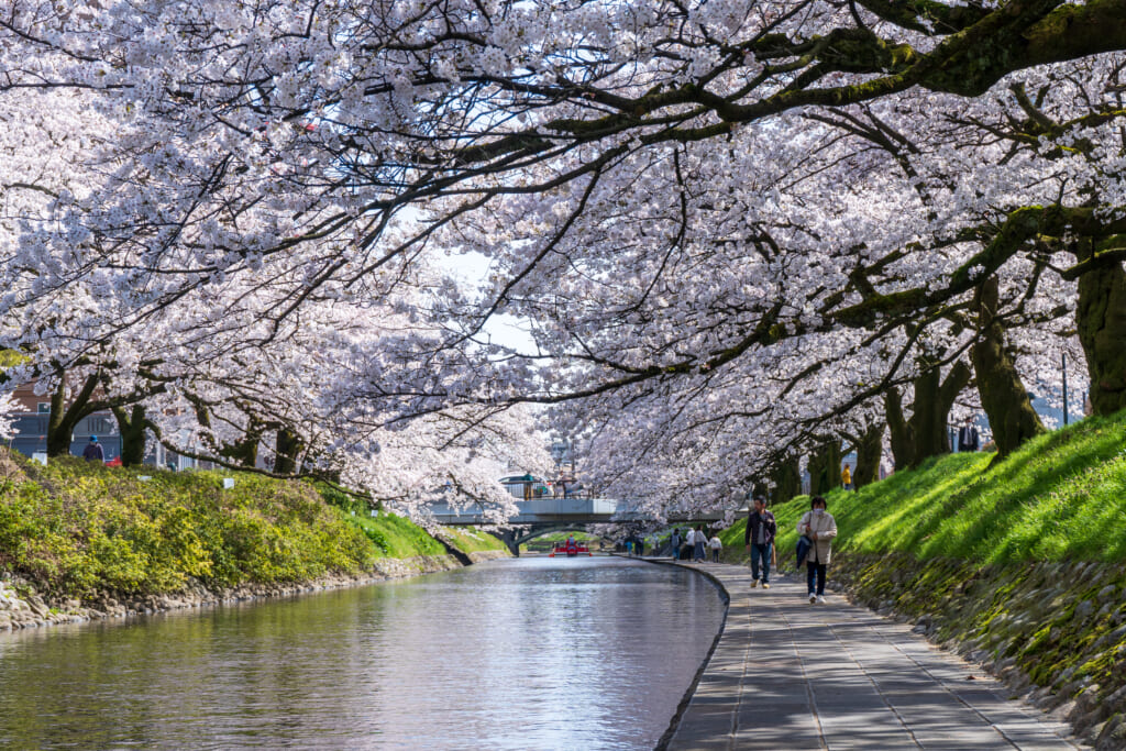 「日本さくら名所100選」に選ばれた桜並木は、川沿いにふんわりと続く“桜のトンネル”が魅力で、橋の上から眺める花景色も格別です。