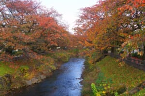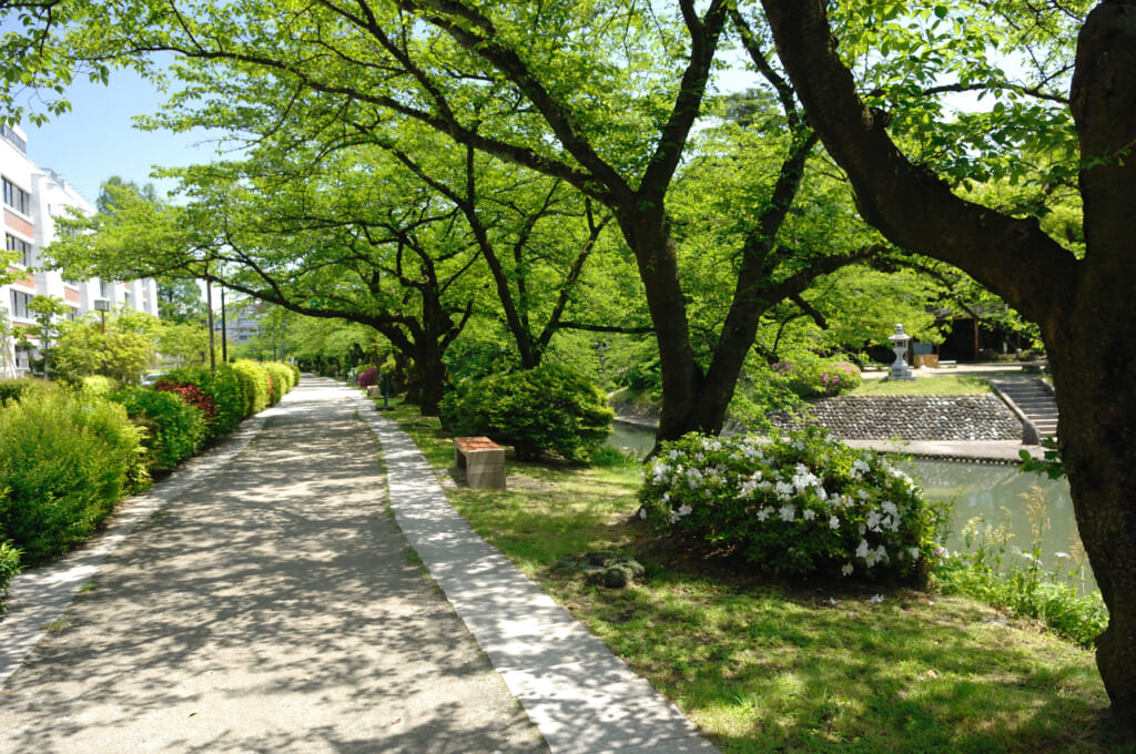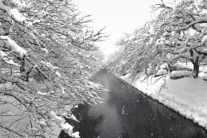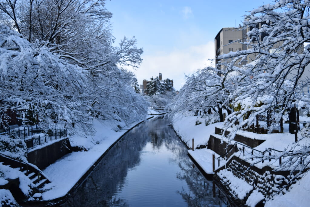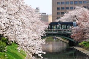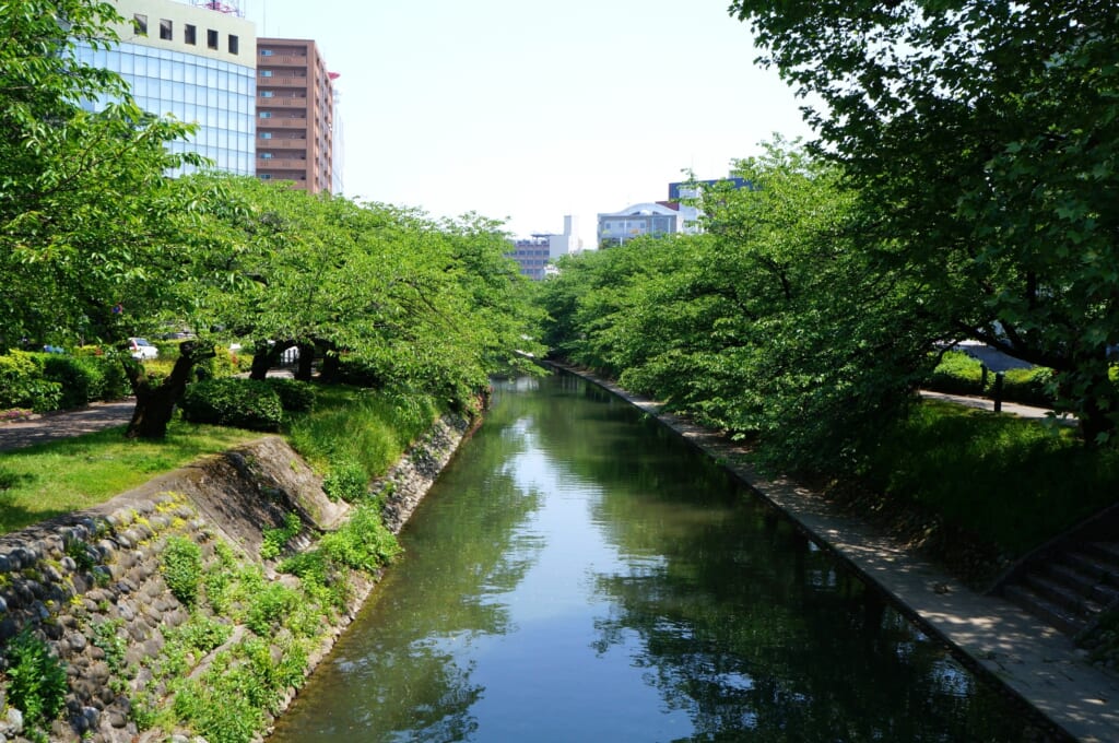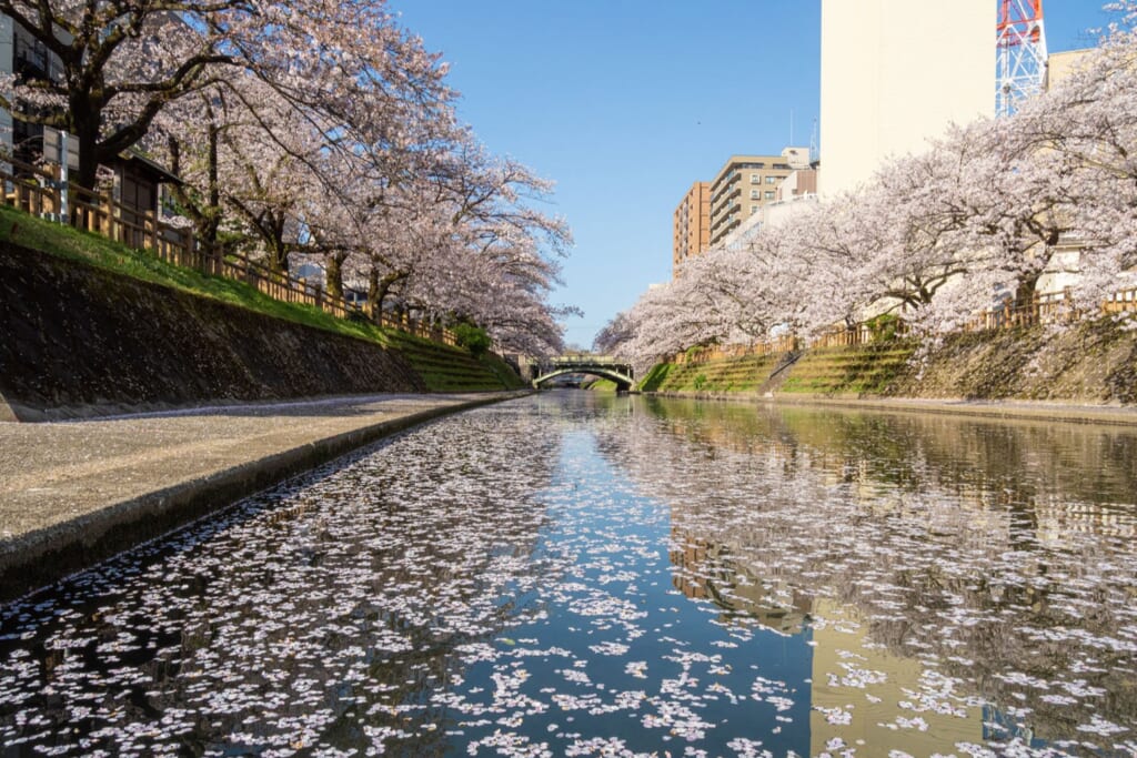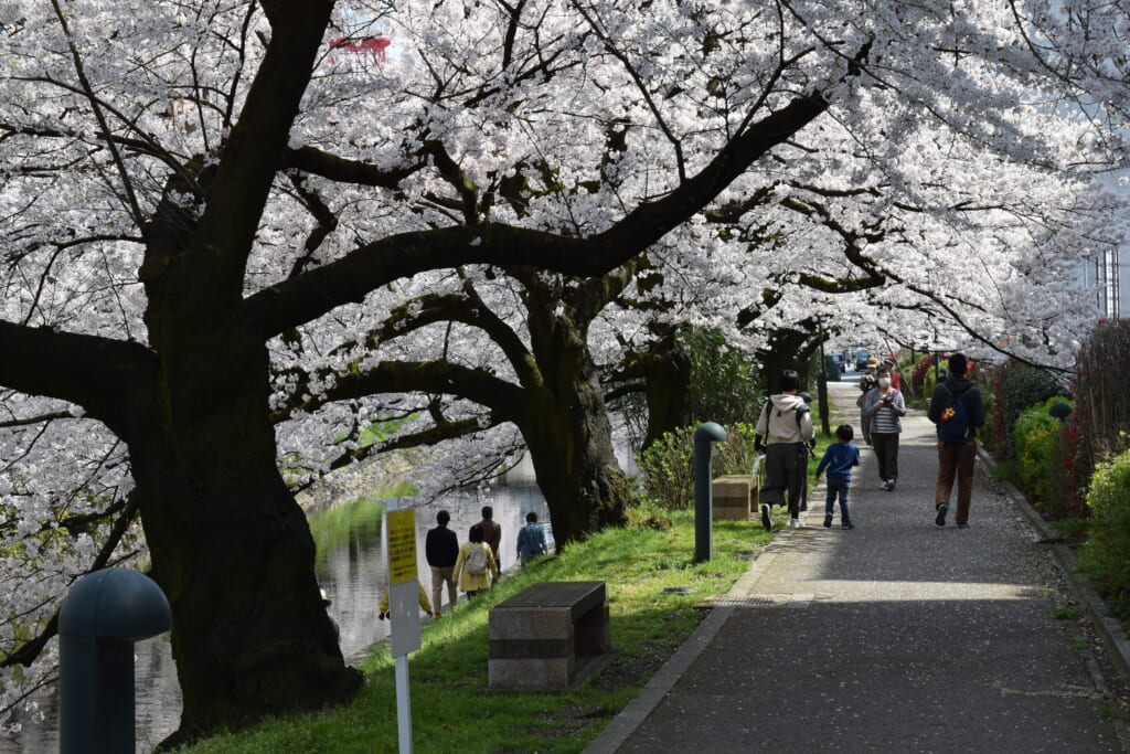 富山市中心部を流れる松川べりは、春になると約2.5kmにわたって約500本のソメイヨシノが咲きそろう、まちなか屈指のお花見スポット。