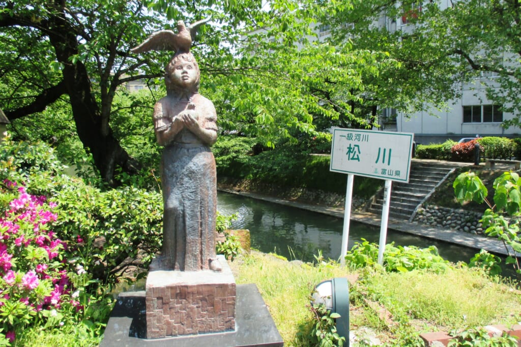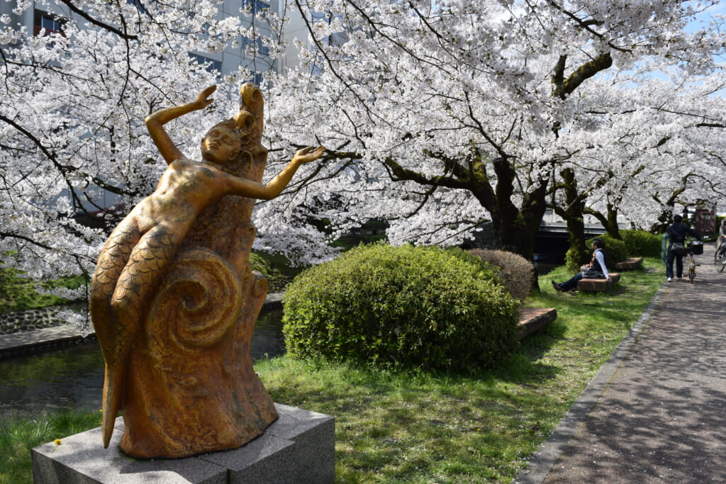 遊歩道には「松川べり彫刻公園」として約1kmに28点の彫刻作品が点在し、花とアートが寄り添う気持ちのいい散策に。水辺から楽しみたい方には、松川遊覧船(富山城歴史クルーズ)でのクルーズもおすすめです。