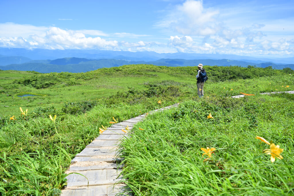 岐阜県との県境に位置する白木峰(標高1,596m)は、ブナ(シロキ)群落が名の由来。山頂一帯にはゆるやかな草原が広がり、ニッコウキスゲやコバイケソウ、イワカガミなど、貴重な高山植物が点在する“花の山”として知られています。なかでも7月のニッコウキスゲの見頃には、斜面が一面の黄色に染まる圧巻の風景に出会えます。
