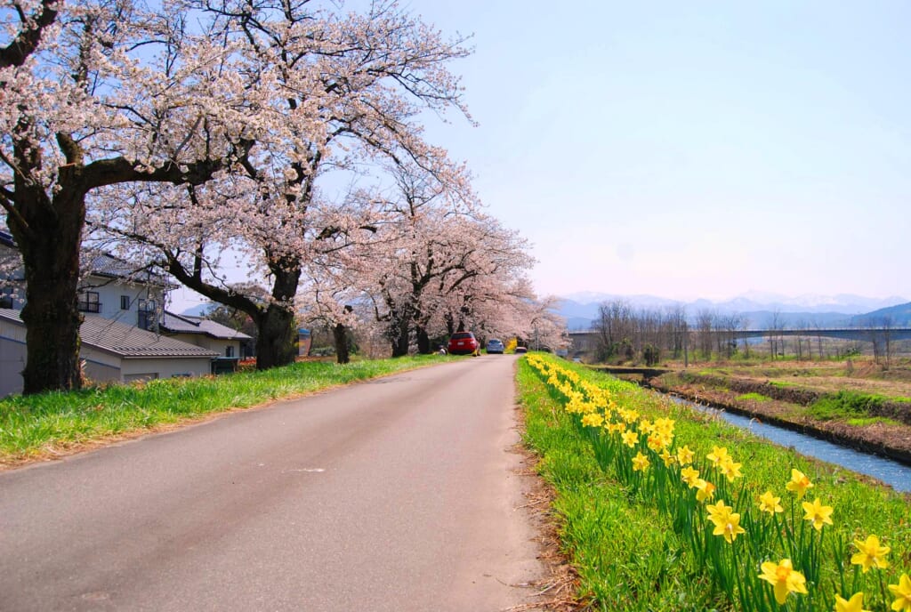 足元には水仙の黄色い花が咲きそろい、桜色とのコントラストがとても華やか。昔、この地域の池から良い塩が見つかったという伝説が残る、ちょっとロマンのあるお花見スポットです。