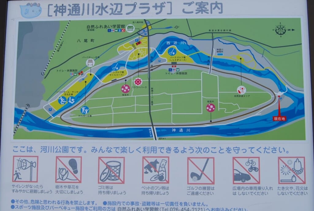 【神通川さくら堤】富山駅(南口)から富山地鉄バス「八尾営業所 行き」に乗車(約35分) → 「広田南口」で下車、徒歩約30分