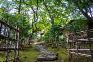 円山庵は、茶人・金子宗峰氏が建築した茶室で、建物にはさまざまな趣向が凝らされています。