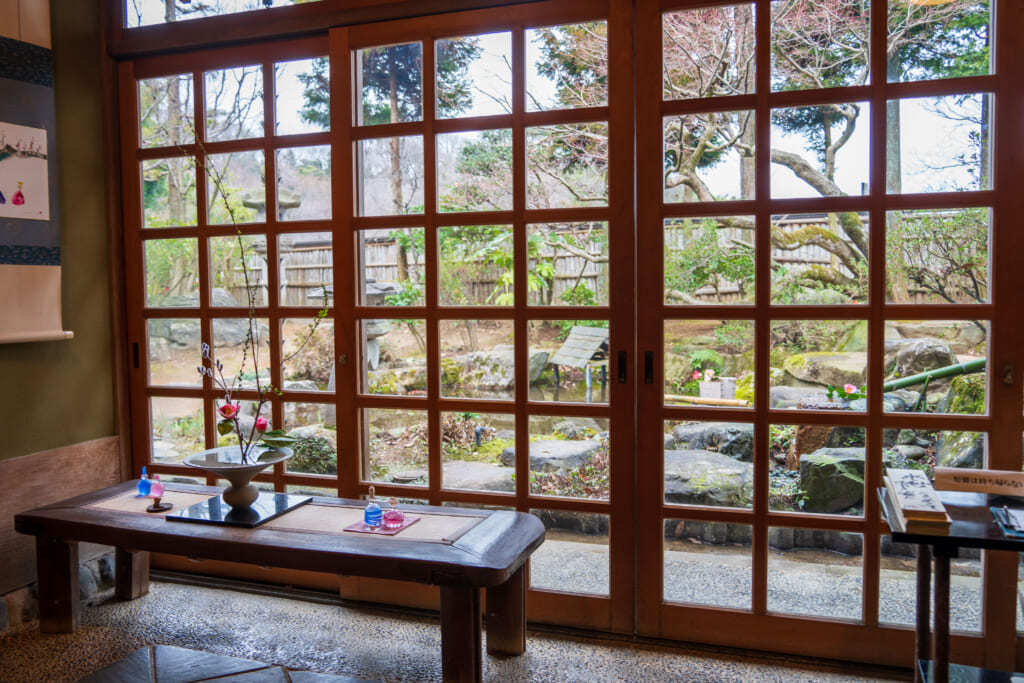 奥の茶室では、晴れた日には窓から立山を望めると案内されており、建築と自然が調和する空間そのものも大きな見どころです。