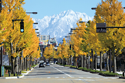 平和通り(富山まちなか病院前)では、秋にはイチョウ並木の紅葉とともに、雪を頂き始める剣岳(つるぎだけ)を見ることができます。※紅葉の見頃は、例年11月上旬~中旬